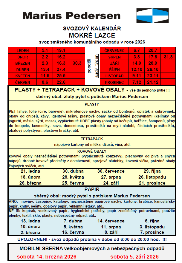 na rok 2026. Sběr elektroodpadu probíhá v obecní stodole každé sudé pondělí v době od 16.00 do 18.00 hodin (v den svozu popelnic).