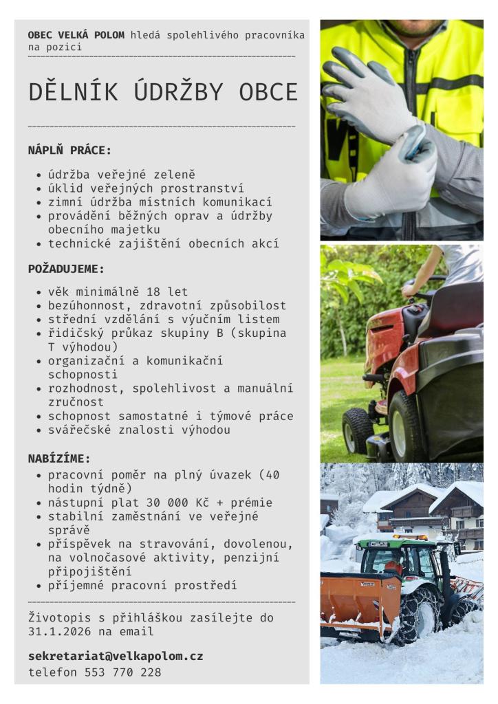 nabízí pracovní místo zaměstnance obce - dělník.